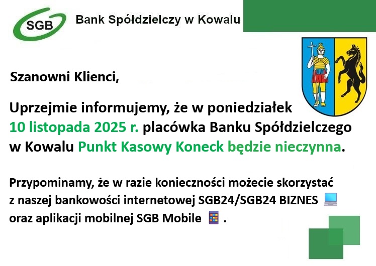 Uprzejmie informujemy, że w poniedziałek 10 listopada 2025 r. placówka Banku Spółdzielczego w Kowalu Punkt Kasowy Koneck będzie nieczynna.